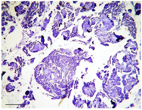 Masson Trichrome, collagen core of rosettes stained blue (40× objective lens, scale bar = 50 μm).