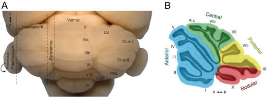 - Marzban, H.; Hawkes, R. On the Architecture of the Posterior Zone of the Cerebellum. Cerebellum 2010, 10, 422–434. [Google Scholar] [CrossRef]