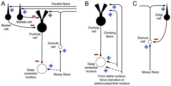 Basic diagrams of the main cerebellar circuits. (A) mossy fibers excite granule cells, which also stimulate Purkinje, stellate, and basket cells. At the same time, stellate and basket cells inhibit Purkinje cells; the latter constitutes the only output of the cerebellar cortex, inhibiting deep cerebellar nuclei. (B) climbing fibers and other inputs from either the raphe nucleus, the locus coeruleus, or the pedunculopontine nucleus excite Purkinje cells, which inhibit deep cerebellar nuclei. All cerebellar inputs send excitatory collateral synapses to deep cerebellar nuclei (dotted lines). (C) granule cells, stimulated by mossy fibers, excite Golgi cells, which inhibits the latter in a negative feedback loop. +, excitatory synapsis; −, inhibitory synapsis.