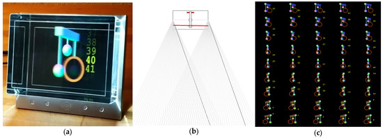 Some AS displays work by using a lenticular lens, such as The Looking Glass (TLG) (Looking Glass, New York, NY, USA) displays, shown in Figure 1a below. In these devices, an array of lenticular lenses is attached to the top of the screen. The lenticular array distributes the pixels of the display to multiple viewpoints. Each lens behaves like a tiny magnifying glass, inflating one of the sub-pixels and hiding the remaining ones. However, depending on the angle of view, each inflated sub-pixel is different. Since both eyes watch the screen from slightly offset angles, they both see different sub-pixels in any given location of the screen, creating binocular disparity, as shown in Figure 1b [21]. Figure 1c showcases the TLG’s simultaneous 45 viewpoints/images rendered to create its 3D visualization.