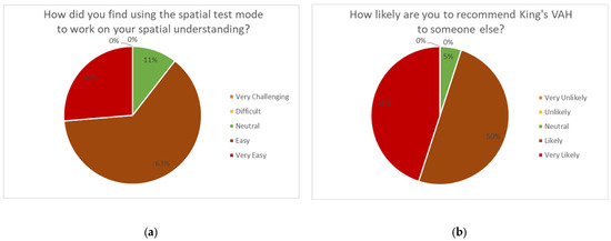 Pie charts of two user experience Likert scale results. (a) The figure shows a pie chart of the results to the question “How did you find using the spatial test mode to work on your spatial understanding?”. (b) The figure shows a pie chart of the results to the question “How likely are you to recommend King’s VAH to someone else?”.