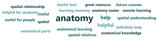 The most common themes that appeared in the responses to the question “Based on today’s session, to what extent do you think King’s VAH might impact your future anatomical learning?” were ‘helpful’ or ‘useful’. Visualized in a word cloud in Figure 8, the words helpful or useful appeared in 45% of people’s responses.