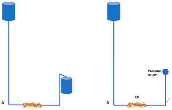 Schematic illustration of water flow (A) and pressure (B) experiment. Pressure is measured at the point indicated by the orange arrow.