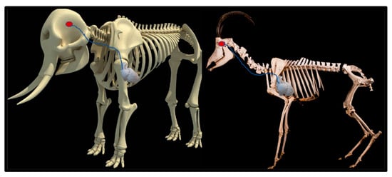 Another observation in a giraffe that differs from other Artiodactyls and Perissodactyls is the heart’s position concerning the brain. The pathway from the heart to the brain is notably straight, lowering resistance to flow and relieving pressure from the heart pumping 2 m against gravity to the brain. In a study on giraffes, [] measured carotid blood flow and calculated the resistance to flow at head-up and head-down positions. Their results showed that when the head is raised, extracranial vasoconstriction takes place to prevent fainting. When the head is down, they suggest that blood flow to the brain is unrestricted. When looking at the position of the heart and the pathway from the heart to the brain, a notable straight path can be observed in comparison to other animals in which the heart is situated at an angle to the brain. The angle creates a bent path for blood flow from the heart to the brain, increasing arterial resistance [,,]. The 2-m head-to-heart pathway of blood in giraffes has less resistance than, for example, sables and elephants’ pathways due to the straight pathway. This supports the idea of little or no control of blood flow to the brain in the head-down position. The observed notable bending of the maxillary artery before entering the rostral epidural rete mirabile in an otherwise straight pathway creates additional resistance to blood flow rushing to the brain when the head is lowered. The twisted arteries of the rostral epidural rete mirabile, the significant length of the rete arteries and the notable bend at the maxillary before entrance into the rete all in conjunction provide resistance to flow and therefore aid in the prevention of brain damage with the quick bending down from a fully erect to a ground position.