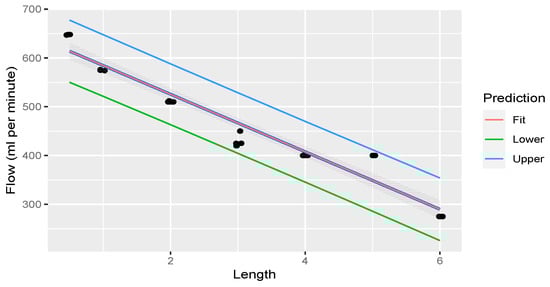 Linear regression through measurements illustrating flow rate decreasing with an increase in rostral epidural rete mirabile length. The shaded area indicates the 95% confidence region of the regression line, and the outer lines indicate the 95% prediction interval for observations.