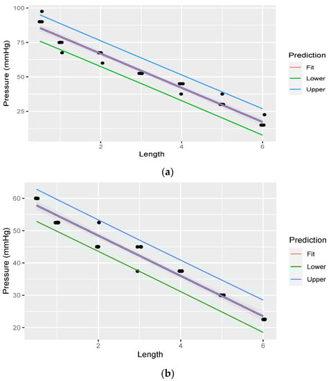 (a). Linear regression through measurements illustrating pressure decreasing with an increase in rostral epidural rete mirabile length, with head-up, with pressure measured post the rostral epidural rete structure. The shaded area indicates the 95% confidence region of the regression line, and the outer lines indicate the 95% prediction interval for observations. (b). Linear regression through measurements illustrating pressure decreasing with an increase in rostral epidural rete mirabile length, with head-down, with pressure measured post the rostral epidural rete structure. The shaded area indicates the 95% confidence region of the regression line, and the outer lines indicate the 95% prediction interval for observations.