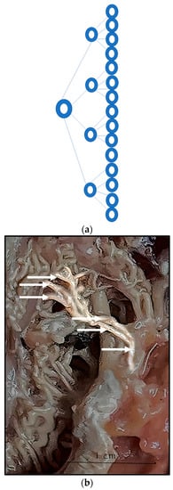 (a). Schematic presentation of bifurcation of the rostral epidural rete mirabile arteries. (b). Highlighted arteries of the rostral epidural rete mirabile indicating bifurcation (marked by white arrows) with arteries splitting into several arteries remaining similar in size.