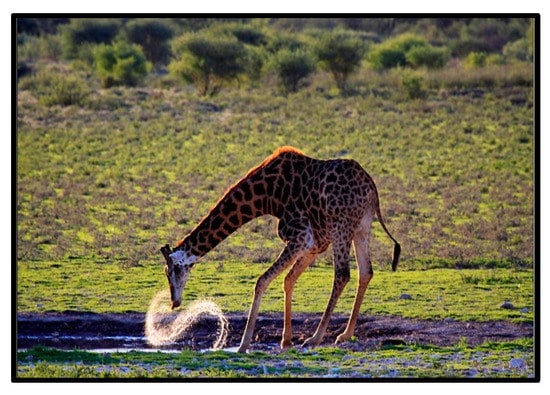 - Mitchell, G.; Skinner, J.D. How Giraffe adapt to their extraordinary shape. Trans. R. Soc. S. Afr. 1993, 48, 207–2108. [Google Scholar] [CrossRef]