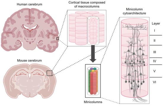 The columnar and stratified organization of the cerebral cortex. Cerebral cortical tissues display repeated, column-like patterning with nested, self-similar minicolumns at finer scales. Cells within minicolumns are distributed by cell type into distinct layers (laminae). This figure was created with BioRender.com (accessed on 19 May 2023).