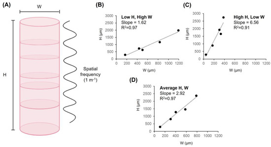 Spatial frequency of lamination and the dimensions of cortical columns. (A) Width (W), height (H) and spatial frequency (1 m−1) plotted along a macrocolumn. Plotting column dimension values for M. mulatta, S. sciureus, M. Musculus, A. leptorhynchus and G. gallus revealed slope values of (B) 1.62, (C) 6.56, and (D) 2.92 for three types of columns: Short and wide columns (Low H, High W), long and thin columns (High H, Low W), and average columns (Average H, W). R2 values are also reported. This figure was partly created with BioRender.com, accessed on 19 May 2023.