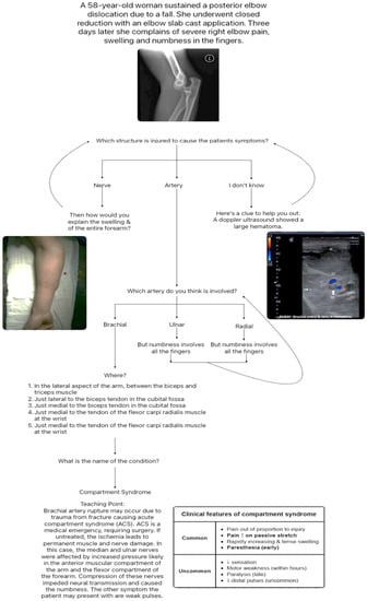 This figure demonstrates a single example of a diagnostic decision tree. In this particular example students will start with partial knowledge and as they provide answers and speculations will obtain more information or hints in the form of questions to further guide them to the correct answer. In this particular case the final diagnosis is compartment syndrome. Embedded images retrieved from PM Robinson, E Griffiths and AC Watts [51] for the x-ray image, I Gedi Ibrahim and M Tahtabasi [52] for the doppler ultrasound image, and D Suvashis, M Rahul and P Lukesh [53] for the arm image.