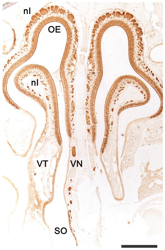 - Garrosa, M.; Gayoso, M.J.; Esteban, F.J. Prenatal Development of the Mammalian Vomeronasal Organ. Microsc. Res. Tech. 1998, 41, 456–470. [Google Scholar] [CrossRef]