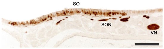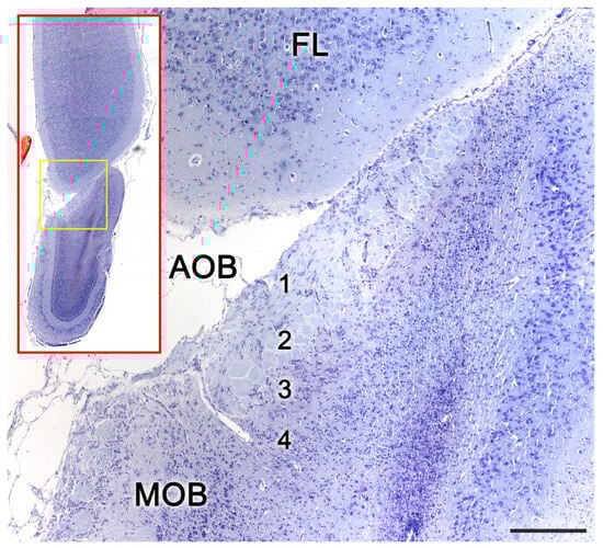 - Taniguchi, K.; Nii, Y.; Ogawa, K. Subdivisions of the Accessory Olfactory Bulb, as Demonstrated by Lectin-Histochemistry in the Golden Hamster. Neurosci. Lett. 1993, 158, 185–188. [Google Scholar] [CrossRef]