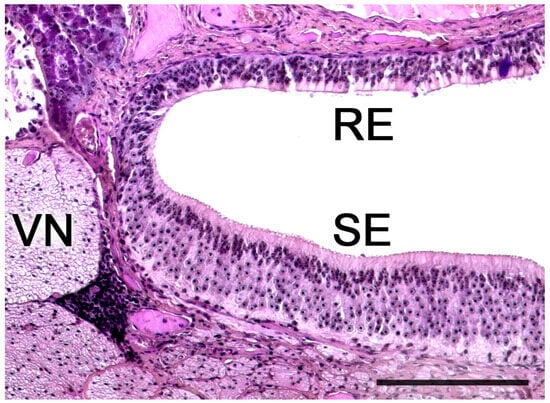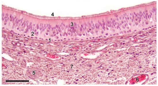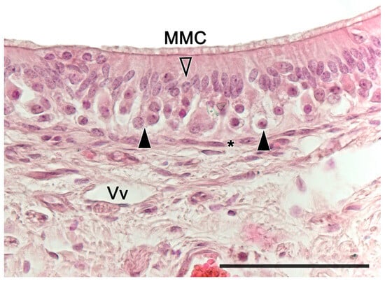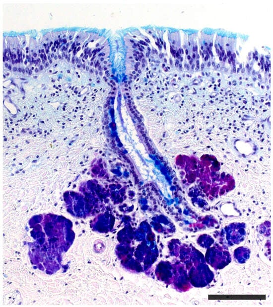 - Pastor, L.M.; Frutos, M.J.; Graña, L.; Ramos, D.; Gallego-Huidobro, J.; Calvo, A. Histochemical Study of Glycoconjugates in the Nasal Mucosa of the Rat and Guinea pig. Histochem. J. 1992, 24, 727–736. [Google Scholar] [CrossRef] [PubMed]