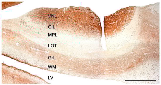 - Torres, M.V.; Ortiz-Leal, I.; Ferreiro, A.; Rois, J.L.; Sanchez-Quinteiro, P. Neuroanatomical and Immunohistological Study of the Main and Accessory Olfactory Bulbs of the Meerkat (Suricata suricatta). Animals 2021, 12, 91. [Google Scholar] [CrossRef]