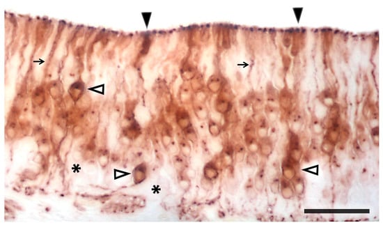 - Nakajima, T.; Sakaue, M.; Kato, M.; Saito, S.; Ogawa, K.; Taniguchi, K. Immunohistochemical and Enzyme-Histochemical Study on the Accessory Olfactory Bulb of the Dog. Anat. Rec. 1998, 252, 393–402. [Google Scholar] [CrossRef]