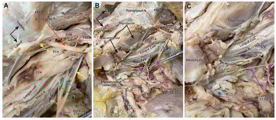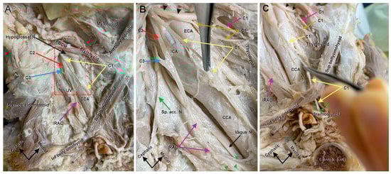 In the right anterior triangle of the neck, we identified the hypoglossal nerve (Figure 1A, black arrow), along with nerve roots C1–C3 of the cervical plexus (Figure 1A, yellow, red, and blue arrows, respectively), which typically join distally to form the AC (Figure 1A). Two branches of C1 emerged medially from the hypoglossal nerve, one diving under the mylohyoid (Figure 1B, pink double-headed arrow) and another innervating the thyrohyoid (Figure 1B, brown double-headed arrow). Upon further dissection, it was discovered that the third and most lateral branch of C1, which typically forms the superior root of the AC, remained isolated throughout the carotid triangle (Figure 1B, yellow arrows). Rather than joining the inferior root of the AC (IRAC, Figure 1, purple arrow) near the carotid bifurcation, this branch traveled independently, anterior to the common carotid artery, under the superior belly of the omohyoid (Figure 1C, yellow arrows), before branching to supply the sternothyroid and sternohyoid muscles (Figure 1C, green arrowheads). The fibers from C2 and C3 (Figure 1A,B, red and blue arrows, respectively) joined to form the inferior root of the AC (Figure 1A–C, purple arrows), which continued independently until it divided into multiple smaller branches, deep to the tendon separating the superior and inferior belly of the omohyoid (Figure 1B, green arrowheads).