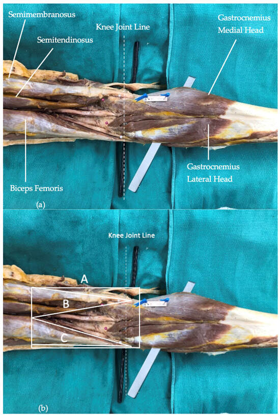 Measurements of the muscular boundaries of the popliteal region (i.e., biceps femoris, semimembranosus/semitendinosus, and medial and lateral heads of gastrocnemius), as well as the space between each muscle, where completed according to a standardized measurement rubric (Figure 1a–c), while each cadaveric specimen was positioned prone, knees fully extended, and held at zero degrees of rotation. More specifically, the superior and inferior boundaries of the hamstring (Figure 1b) and gastrocnemius (Figure 1c) muscles within the popliteal region were identified and marked, along with the point at which each muscle crossed the posterior joint line of the knee. The widths of each muscle were measured to the nearest cm at each of these points, helping to form a rectangular shape. The area of this rectangle was then used to calculate the total area of the posterior knee region. The knee joint line was defined as the space between the tibia and the femur.