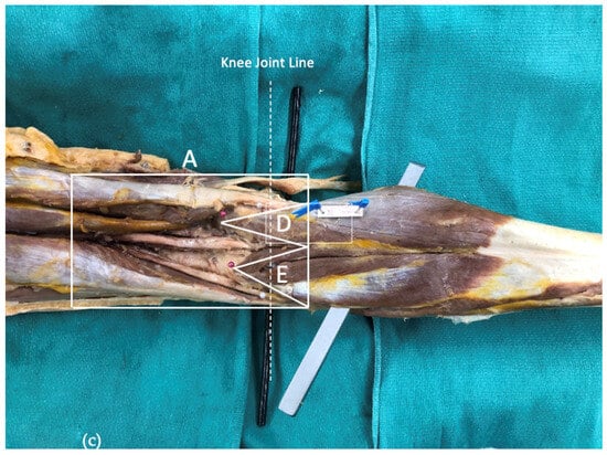 (a). Image of a fully dissected posterior knee. This figure illustrates the popliteal region of the posterior knee. The anatomical position of the hamstrings and gastrocnemius can be seen with respect to the knee joint line. (b). Hamstring muscle contribution to popliteal fossa. A: area of posterior knee region (rectangle). B: area of semimembranosus/semimembranosus within the posterior knee region. C: area of biceps femoris within the posterior knee region. (a,b) legend: The area of each of the muscles was calculated using Heron’s formula. The total area of muscle within the posterior knee region = B + C + D + E. The total area of space (fossa) within the posterior knee region = A − (B + C + D + E). (c). Gastrocnemius contribution to popliteal fossa. A: area of posterior knee region (rectangle). D: area of medial gastrocnemius head within the posterior knee region (blue triangle). E: area of lateral gastrocnemius head within the posterior knee region (blue triangle). (c) legend: The area of each of the muscles was calculated using Heron’s formula. The total area of muscle within the posterior knee region = B + C + D + E. The total area of space (fossa) within the posterior knee region = A − (B + C + D + E).