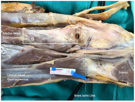 Origin of medial gastrocnemius (reflected superiorly) at medial femoral condyle. Medial gastrocnemius head reflected superiorly. Lateral gastrocnemius head reflected superiorly. A: area of tendon at the origin of the medial gastrocnemius head. B: area of muscle at the origin of the medial gastrocnemius head. Legend: The origin of the medial gastrocnemius head at the medial femoral condyle at the posterior knee is presented. The gastrocnemius is cut at the Achilles tendon and superiorly reflected over the hamstrings to provide a better view of the proximal attachment of the medial gastrocnemius head on the femoral condyle. The area of muscle only included the triangular area “B” from the proximal attachment to the femur until the most distal point of the musculotendinous junction. The area of the tendon “A” and area of the muscle “B” in the proximal region of the medial gastrocnemius head were calculated using Heron’s formula (See Appendix A).