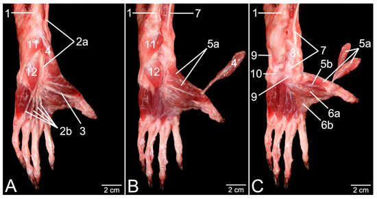 The musculature of the hallux can be studied in Figure 4, which shows the plantar side of the foot after the plantar aponeurosis, both heads of the flexor digitorum brevis muscle, and the lumbrical muscles after resection. Medial to the Achilles tendon (Figure 4A–C, nr. 1), the common tendon of the flexor digitorum tibialis (medialis)/longus muscle (Figure 4A, nr. 2), which obscures the common tendon of the flexor digitorum fibularis/lateralis muscle, can be identified. As already mentioned, this tendon splits into four individual tendons for digits II to V (Figure 4A, nr. 2b). Its individual tendon to digit I merges with the respective individual tendon of the flexor digitorum fibularis/lateralis muscle (Figure 4A, nr. 3). The common tendons of both the flexor digitorum tibialis (medialis)/longus and flexor digitorum fibularis/lateralis muscles are obliquely crossed by the abductor hallucis muscle (Figure 4A, nr. 4) that runs from the medial side of the calcanean tuber to the abaxial side of the proximal phalanx of the hallux.