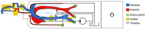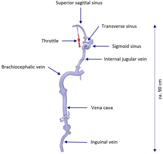 The venous system was designed and developed according to the standardised procedure of Spallek et al. []. Patient data were not available for the entire venous system. The 3D anatomical atlas of Zygote Body online (Zygote Media Group, American Fork, UT, USA) [] and the diameter requirements were used as the basis for the vein models. The following veins were designed for the development of a venous system: the inguinal vein, the vena cava, the brachiocephalic vein, the internal jugular vein, the sigmoid sinus, the transverse sinus and the superior sagittal sinus (see Figure 1 (blue)). The holders were subsequently designed to hold the internal jugular vein, the sigmoid sinus, the transverse sinus, the superior sagittal sinus, as well as the connection between the arterial and venous systems on the angiography table (see Figure 1). Removable holders were also designed for the vena cava and the inguinal vein on the HANNES simulator (see Figure 1).