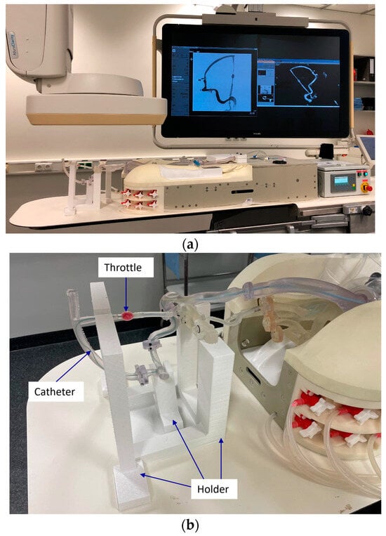 Test setup (a) of the complete HANNES simulator in the angiography and (b) of the redesigned vein models integrated into HANNES, from the brachiocephalic vein to the throttle and its holders. Probing with a catheter can be seen through the transparent vessel models.