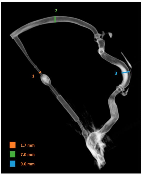 Finally, a 3D DSA image of the venous system was taken, as shown in Figure 6. The image was used to measure the diameter of the vein models. This shows that the vein system behind the throttle had the smallest diameter of 1.7 mm. The superior sagittal sinus had a diameter of 7.0 mm, while the sigmoid sinus had a diameter of 9.0 mm.