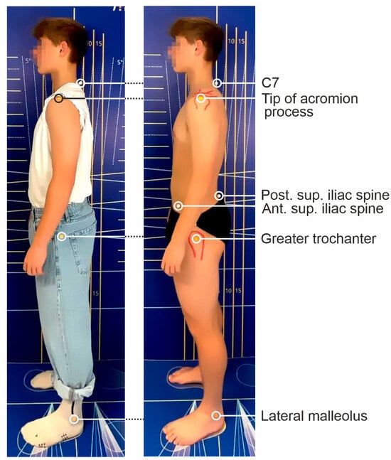 The primary anatomical landmarks used for sagittal posture analysis (Figure 1) are the external auditory canal (meatus acusticus externus), more specifically, the center of the tragus, the acromion (shoulder height) and the trochanter major (greater trochanter) []. The external malleolus or a point located 1–2 cm distal to it (at the calcaneo-cuboid joint) serves as the reference point for the plumb line, through which the projection of the center of mass usually runs.