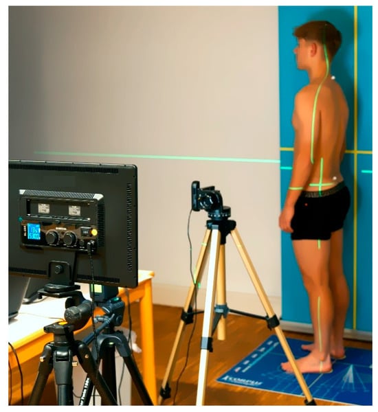 The posture photographs can be analyzed using appropriate video or graphical programs (e.g., Dartfish®, Fribourg, Switzerland; or Kinovea®, www.kinovea.org accessed on 7 March 2025). When measuring angles, care should be taken to align the vertical or horizontal reference planes using the reference lines on the calibration wall to avoid possible camera tilt.