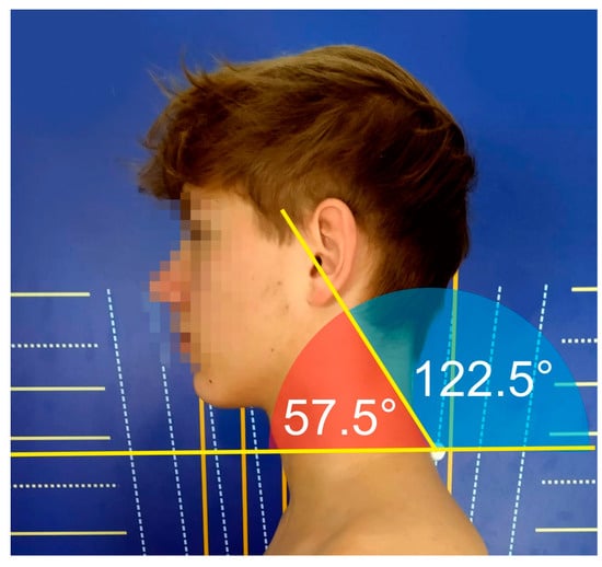 The craniovertebral angle, or CVA (also referred to in other studies as the neck inclination angle, cervical angle or head protrusion angle), is a measure of the forward inclination of the head. The test quality criteria for this parameter (inter-rater and intra-rater reliability) have been confirmed []. For example, Salahzadeh et al. found an ICC of 0.90 for intra-rater reliability, 0.92 for inter-rater reliability and 0.96 for intra-subject reliability []. In general, the acute angle is calculated as shown in Figure 6; the smaller the angle, the more the head tilts forward. Since there is a correlation between a greater forward head tilt and the occurrence of shoulder and neck complaints [,,], this parameter is useful in the context of posture diagnostics []. Likewise, a correlation is suspected between a smaller CVA and occlusal disorders [].
