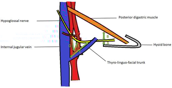 In this study, we measured the position of the hypoglossal nerve in relation to several anatomical landmarks, including the venous thyro-linguo-facial trunk as it emerges from the internal jugular vein, the carotid arteries (internal and external), the greater horn of the hyoid bone, and the digastric muscle (Table 1).