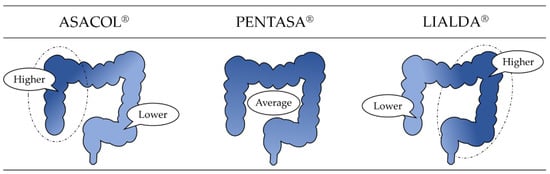 In clinical practice, multiple oral 5-ASA formulations are available, with each having a unique efficacy profile. Although 5-ASA has been shown to act on the local mucosa [], when 5-ASA is orally administered, most is absorbed in the upper gastrointestinal tract and does not reach the large intestine, where lesions are present. Therefore, different drug delivery systems have been developed for each oral 5-ASA formulation. Currently, the oral 5-ASA formulation approved in Japan is salazosulfapyridine (SALAZOPYRIN®; Pfizer Japan Inc.: Tokyo, Japan), in which 5-ASA and sulfapyridine are azo-bonded []. In addition, there are several 5-ASA release formulations, including ASACOL®; ZERIA Pharmaceutical Co., Ltd.: Tokyo, Japan (delayed release formulation dependent on pH) [], PENTASA®; KYORIN Pharmaceutical Co., Ltd.: Tokyo, Japan (delayed release formulation dependent on time) [], and LIALDA®; MOCHIDA Pharmaceutical Co., Ltd.: Tokyo, Japan (delayed release formulation dependent on pH and time) [] (Table 1).