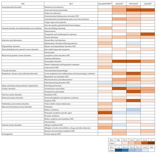 Differences in safety signals of oral 5-aminosalicylate preparations by drug delivery system: SOC: System Organ Class, HLT: High Level Term, NEC: Not Elsewhere Classified, IC: information component, NA: Not available.