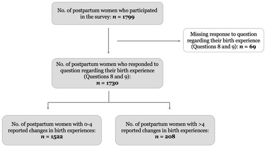 In total, 1730 postpartum women were included in this study. Of these, 1522 (88.0%) women had experienced 0–4 birth-related changes and 208 (12.0%) women had experienced >4 pregnancy and birth-related changes (Figure 1).