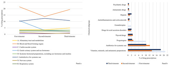 Based on anatomical group classes, drugs used for conditions of the blood and hematopoietic organs (ATC B) were observed in the highest proportion of women in all trimesters of pregnancy (21.5%, 13.9%, and 19.4 in the first, second, and third trimester, respectively). The drugs belonging to the category of antimicrobials for systemic use (ATC J) were the second most prescribed during pregnancy, with a peak of 12.5% during the second trimester. Regarding chemical classification, vitamins, minerals, and anti-anaemic preparations were prescribed in 20.8%, 13.3%, and 18.3% of deliveries over the trimesters of pregnancy. Figure 1 shows the prevalence of drug prescriptions according to selected anatomical (Panel (a)) and chemical (Panel (b)) subgroups.