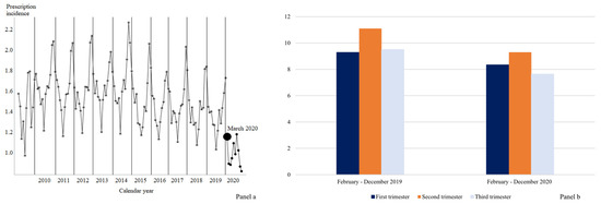 Trend in antibiotics use (Panel (a)) and antibiotics use in 2019–2020 according to trimesters of pregnancy (Panel (b)). Lombardy, Italy, 2010–2020.