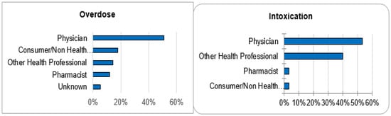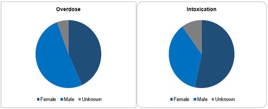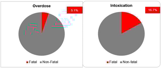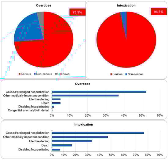 Regarding the assessment of seriousness, 73.9% and 22.4% of cases of overdose were categorized as serious and non-serious, respectively. The seriousness category of the remaining 3.7% was unknown. The majority of the cases were classified as serious because they either caused or prolonged hospitalization (52.3%), caused other medically important conditions (36.9%), or resulted in life-threatening complications (4.7%). One case resulted in a congenital anomaly/birth defect. For the cases of intoxication, 96.7% were categorized as serious, whereas 3.3% were non-serious. Out of the serious cases, 42.6% caused or prolonged hospitalization, 25.9% caused other medically important conditions and 18.52% resulted in life-threatening complications. The data regarding seriousness are depicted in Figure 5.