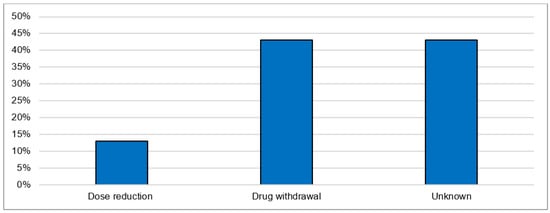 The most postulated causality of CNI intoxication was the interaction with CYP 3A4 inhibitors (40.0%). The exact cause in the majority of cases (50.0%) is unknown. The most frequently co-reported active ingredients that are known CYP 3A4 inhibitors are clarithromycin, voriconazole, itraconazole, amlodipine and dasabuvir. The most commonly reported manifestations were acute kidney failure (36.7%) and gastrointestinal disturbance: diarrhea (16.7%) and vomiting (10.0%). As general supportive measures, the actions taken after intoxication were immediate drug withdrawal (43.3%) and dose reduction (13.3%). For the remaining cases, the exact treatments undertaken were not reported (Figure 6). The mortality rate after CNI intoxication was relatively high at 16.7% compared to 5.1% after overdose (Figure 7).