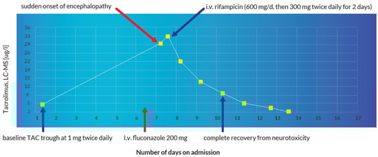 Although acute CNI intoxications are rare, they can lead to life-threatening complications such as multiple organ dysfunction that can potentially result in fatal outcomes. The commonest cause is the interaction with CYP 3A4 inhibitors rather than overdose. In the index case, the concomitant administration of a single intravenous dose of fluconazole resulted in a 6-fold increase in the baseline TAC blood trough level due to the inhibition of the hepatic CYP3A4 metabolism. TAC intoxication manifested as acute neurotoxicity, nephrotoxicity and hepatotoxicity as depicted in Figure 10 and Figure 11. The benefit of pharmacoenhancement with rifampicin outweighed the risk of further liver injury in this patient with an imminent case of severe acute TAC intoxication. Although rifampicin is contraindicated in patients with severe pre-existing or acute liver injury, it was administered as an off-label therapy after rigorous risk-benefit analysis. In addition to prompt drug withdrawal and general supportive measures, pharmacoenhancement with a 3-day regimen of intravenous rifampicin accelerated the metabolism and clearance of TAC, which resulted in an instantaneous and remarkable recovery of the patient. In VigiBase™, apart from drug withdrawal or dose reduction, there are no ICSRs whereby CYP inducers were utilized as treatments. In about 43% of reported cases, the exact treatments or actions taken were not reported. In published articles, diverse pharmacoenhancement strategies with phenobarbital, phenytoin and rifampicin were described in 34 distinct clinical cases. Due to the lack of clinical cases whereby the effect of TAC withdrawal alone compared to that of withdrawal and pharmacoenhancement, multicenter clinical investigations are required to validate the safety and effectiveness of the various pharmacoenhancement strategies. For individual cases, a critical patient-oriented risk-benefit analysis regarding the choice of CYP inducer as well as the dosage and route of administration is highly recommended. For patient safety purposes, when any of the pharmacoenhancement strategies are utilized, the respective CNI concentrations should be closely monitored and the enzyme-inducing therapy should be kept as short as possible (3–4 days). Furthermore, the increased dosage of concomitant medications that are substrates of the induced enzymes should be proactively implemented. The relatively high occurrence of polypharmacy in organ transplant patients under treatment with CNIs requires that health care providers consider drug-drug interactions as potential causes of severe acute CNI intoxication. In this category of patients, it is highly recommended to critically review and consider the dose adjustment of relevant concomitant medications to prevent the need of using other drugs to reverse toxicity.