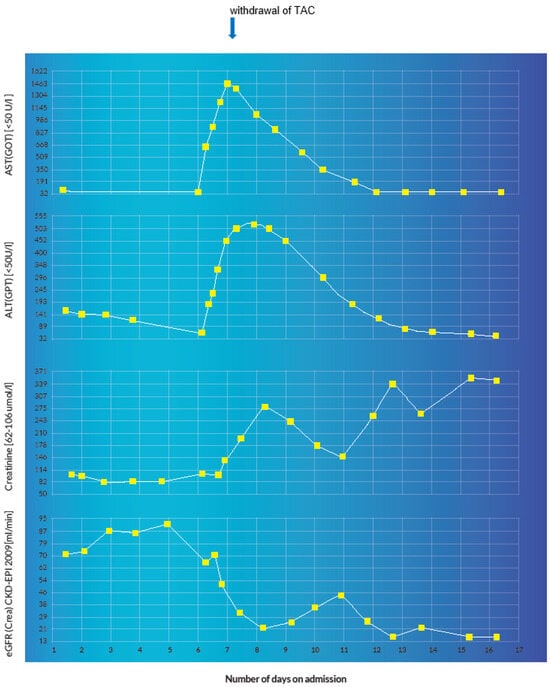 The immediate-release formulation of Prograf® (TAC, Astellas Pharma AG, Wallisellen, Switzerland) is incompletely absorbed in the upper gastrointestinal tract with a bioavailability of approximately 22% (±6) in adult liver transplant patients [3]. With a mean standard dose of 0.30 mg/kg/day at steady-state, the average Cmax and Tmax amount to 74.1 µg/L and 3.0 h, respectively [1]. TAC has an extremely high protein binding capacity of about 99% to plasma proteins (albumin and α-1 acid glycoprotein) and erythrocytes [1,2,3]. Intravenously administered TAC exhibits a two-compartment pharmacokinetic model [1,2,42]. Pharmacokinetic studies with healthy volunteers demonstrate a blood/plasma ratio of about 20/1 with a mean volume of distribution of about 11.5 L/kg (±4.3) [43]. In adult liver transplant patients, this amounts to about 30.1 L/kg (±14.7) [44]. TAC is extensively metabolized by intestinal and hepatic CYP 3A4 as well as CYP3A5 [1,2,3]. Out of the 8 known metabolites of TAC, only 31-O-demethyl-tacrolimus demonstrates similar activity to TAC in in vitro studies [3,45]. The metabolites are excreted primarily in the bile [1,2,3]. Furthermore, it is a substrate as well as a weak inhibitor of the drug transporter P-glycoprotein (P-gp) [3]. The average half-life is reported to be approximately 43 h [1] but can sometimes be longer due to inter-individual variations [46,47]. In adult liver transplant patients, the mean elimination half-life after intravenous infusion is about 12.1 h (±4.7) [44], this is why a 12-hourly dosage interval is routinely implemented. Less than 1% undergoes renal elimination in the unchanged form at a renal clearance of less than 1 mL/min [1,2,3]. This explains why TAC is not significantly eliminated through renal replacement therapy [48]. The concomitant administration of drugs or herbal products that are modulators of CYP3A4 can drastically affect the metabolism and clearance of TAC, which can consequently disrupt therapeutic concentrations [49,50,51,52]. Diflucan® (fluconazole, Pfizer AG, Zurich, Switzerland) is a moderate inhibitor of CYP3A4 and a potent inhibitor of CYP2C9 and CYP2C19 [1,2,3,53]. It is also a weak inhibitor of CYP1A2 [3]. The concomitant administration of fluconazole and TAC led to a clinically significant increase in the mean TAC blood trough concentrations in previous pharmacokinetic studies [54,55]. In the index patient, the concomitant administration of intravenous fluconazole 200 mg (at 06:49 a.m.) and intravenous TAC 0.072 mg (at 07:40 a.m.) on admission day 7 resulted in a sudden elevation (6-fold) of the baseline TAC blood trough concentration accompanied by an acute derangement of the hepatic and renal parameters (see illustration in Figure 10 and Figure 11). A possible iatrogenic overdose was ruled out because the administered intravenous dose of 0.072 mg/d was just about 18% of the expected plasma exposure from the baseline oral dose of 2 mg/d (considering an oral bioavailability of 20%, 2 mg oral formulation is equivalent to 0.4 mg intravenous) [56]. In the measured trough concentration at 07:50 a.m. on admission day 8, no TAC was administered approximately 24 h before the blood sample was withdrawn, which is why a pre-analytical error in the framework of a non-trough level determination was ruled out. Moreover, the quantification was performed using the liquid chromatography technique coupled with mass spectrometry (LC-MS), which is why interfering factors due to co-medication were unlikely [57,58]. In the Swiss drug information of Prograf®, coma and encephalopathy are documented as adverse drug reactions (ADRs) with an incidence of about 0.1–1% whereas acute hepatocellular injury and renal failure are documented with an incidence of about 1–10%. The international databanks, UpToDate™ and Micromedex™, describe these ADRs as life-threatening toxidromes of TAC. VigiBase™ registered 160 cases of coma (PT), 420 cases of encephalopathy (PT), 21 cases of hepatocellular injury (PT) and 1169 cases of renal failure (PT) out of a total of 79,223 ICSRs on tacrolimus since 1992. The repeat TAC concentration of 33.1 µg/L at 4:16 p.m. confirmed the diagnosis of a tacrolimus intoxication and pharmacoenhancement with rifampicin was started at 8:00 p.m. that same day. Under fluconazole-induced CYP inhibition, the effective half-life of TAC reduced from 30.4 h to 27.7 h after 4 days of initiating rifampicin. This was less likely to occur after drug withdrawal alone, in the presence of CYP inhibition. The initial CYP-inducing effect of rifampicin, even within the first few days of treatment, can result in a clinically significant increase in the total clearance of tacrolimus [59]. The administration of rifampicin may result in a reduction of the efficacy of caspofungin through its modulatory effect on transport proteins.