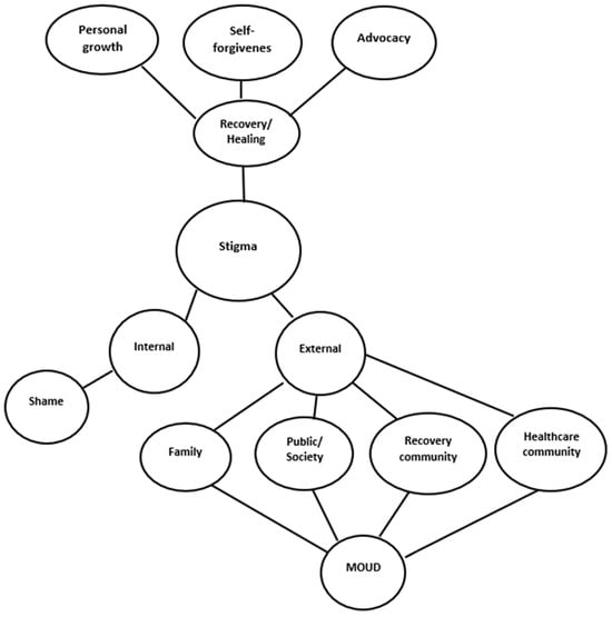 Three main themes were identified through the analysis: external stigma, internal stigma, and healing from stigma. The following subthemes were identified in external stigma: (1) public/society; (2) healthcare; (3) family; (4) recovery community. Shame was identified as the subtheme in experiencing internal stigma, and advocacy and self-forgiveness were identified as themes in recovery from stigma. Several tertiary themes were uncovered, including gender/sexual orientation and medication for opioid use disorder (See Figure 1).