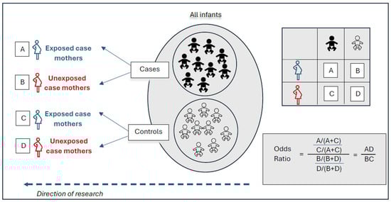 In a retrospective case-control study, cases (infants with birth defects) and controls (infants without birth defects) are identified from the same population. Maternal exposure assessments are made after birth. The odds ratio is calculated by dividing the odds of maternal exposure among case infants by the odds of maternal exposure among the control infants. Adapted from Hales et al. [47].