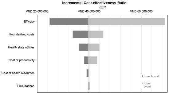 Figure 5 displays a tornado diagram with one-way sensitivity analyses. The ICER was sensitive to varying efficacy (ICER: VND 31.8 M to VND88.3 M), cost of itopride (ICER: VND 43.1 M to VND 56.5 M), and health utility values (ICER: VND 45.2 M to VND 55.3 M).