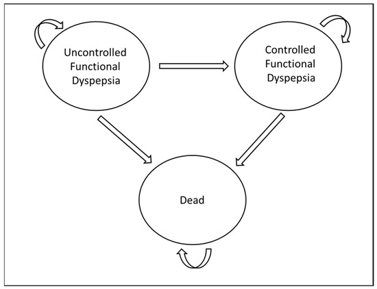 A 3-stage Markov model with the following health states: controlled FD, uncontrolled FD, and dead was developed (see Figure 3).