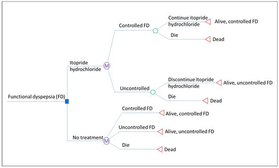 The intervention that is proposed for the treatment of FD is itopride. Itopride is approved by the Drug Administration of Vietnam for the treatment of FD and is currently reimbursed for use in level 1 + 2 hospitals in Vietnam. Itopride is given three times a day at a dose of 50 mg. A pack of 20 tablets of itopride costs VND 105,520, which means that a daily dose of itopride is (VND 105,520/20) × 3 = VND 15,828.