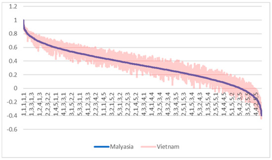 Utility scores are required for economic evaluation as they present a preference-based approach to assessing health-related quality of life. Estimates are scaled with 1.0 representing full health and 0 as equivalent to death. No Vietnamese study was identified estimating a utility score for the health-related quality of life of patients with FD. However, five studies were identified from neighbouring Asian countries, including Malaysia [17,18], Hong Kong [19], South Korea [20], and India [21]. The Malaysian study was the largest of these studies (n = 2000 and n = 2039 rural and urban patients, respectively) and considered the most appropriate for the Vietnamese population. This large cross-sectional study compared the health-related quality of life of those with and without FD. It used a widely accepted generic multi-attribute utility instrument, the EQ-5D-5L, which has been previously considered a valid instrument among patients with dyspepsia [22]. Subsequently, the rural and urban Malaysian studies were pooled to derive an estimate of patients with FD (0.872, SD 0.17) and without FD (0.961, SD 0.099), representing a statistically significant disutility of 0.088 (95% CI: 0.098, 0.080) using a two-tailed t-test. To explore differences in the preferences regarding health-related quality of life between Vietnamese and Malaysian populations, the utility values from the Malaysian and Vietnamese valuation studies were compared. Specifically, the correlation between country-specific utility values for all health states defined by the EQ-5D-5L descriptive system (n = 3126) was assessed using Pearson correlation and plotted for visual comparison (see Figure 5).