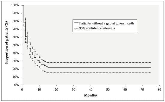 Kaplan–Meier curve for the proportion of patients without a gap at the given month of treatment.