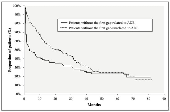 When stratifying all 165 patients by whether their first persistency gap was linked to an ADE or a non-ADE, the Kaplan–Meier curve on the proportion of patients without a persistency gap over time showed that 50% of the ADE group experienced a persistency gap within three months, with the decreasing proportion plateaued at the 45th month (Figure 3).