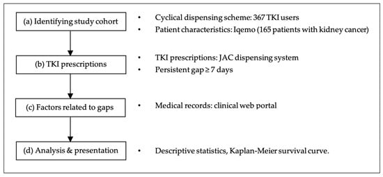 The primary outcome measure of this study is factors associated with TKI persistency gaps, identified from EMRs (CWP) within one month before and after each gap. This period was chosen as it aligns with typical non-urgent hospital contact intervals. Factors were categorised as ADEs, general clinical factors (e.g., surgery), non-clinical factors (e.g., holidays), and others and collected on a factor discovery form. The common side effects of sunitinib, cabozantinib, and tivozanib were included in the ADE list on this form (Figure S5). The study process flowchart is shown in Figure 4.
